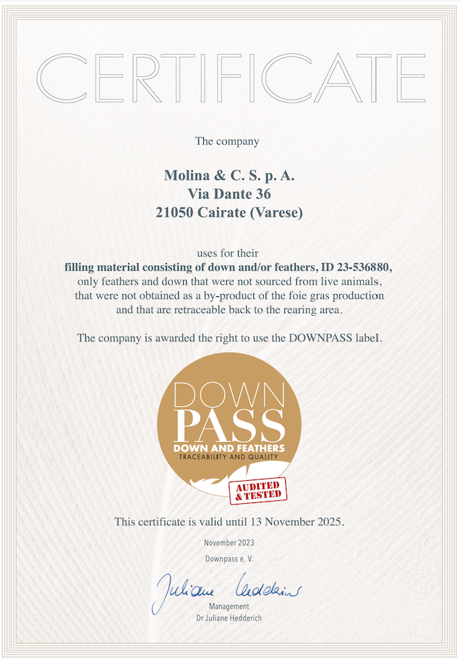 A. Molina & C. S.p.A. ha volontariamente aderito al rispetto dello standard Downpass, controllando e verificando la propria catena di fornitura dell’imbottitura e mantenendo la tracciabilità di ogni lotto di materiale per certificare che i prodotti Molina non provengono da animali vivi o maltrattati.
