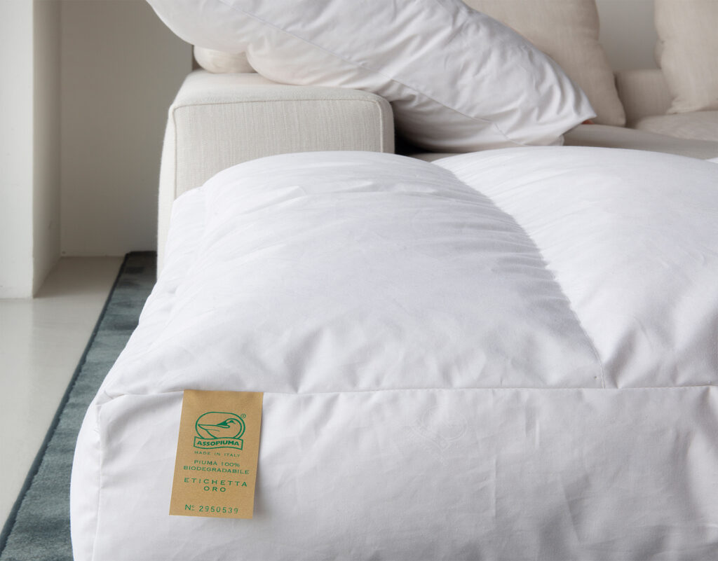 La piuma naturale, accuratamente selezionata e lavorata, rappresenta un materiale d’eccellenza per l’imbottitura: è morbida, elastica, altamente traspirante e capace di adattarsi al corpo, offrendo una sensazione di comfort autentica e naturale.