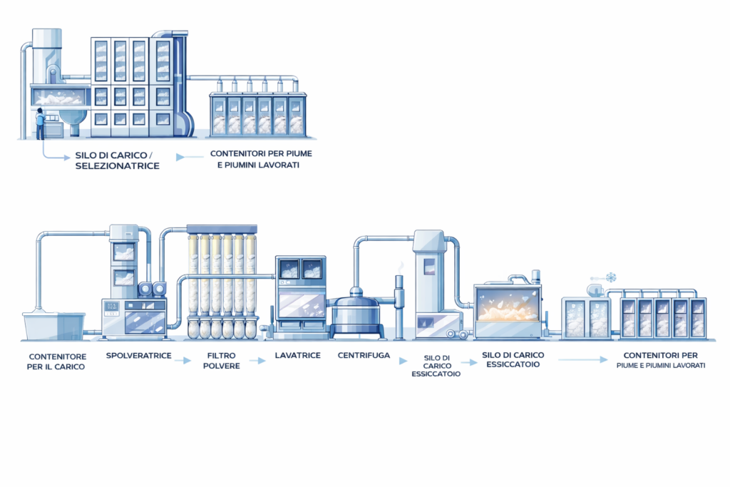 Un elemento centrale della fase di fornitura è la partnership con fornitori di fiducia, che ci consentono l’accesso diretto alle loro supply chain per verificare il pieno rispetto delle norme igieniche e di animal welfare. Il nostro sistema di tracciabilità è certificato secondo i principali standard internazionali, tra cui RDS, DownPass e altri protocolli riconosciuti.